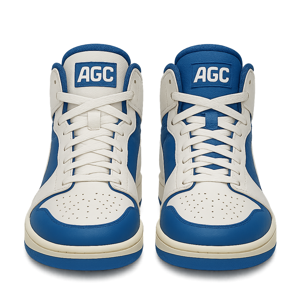 Sous le capot : matériaux premium (microfibre PU, suède technique, mesh 3D), semelle EVA + caoutchouc chevrons pour bitume & parquet, maintien de cheville sans rigidité, confort de 7h à 22h, finition logo AGC tissé et embossé.